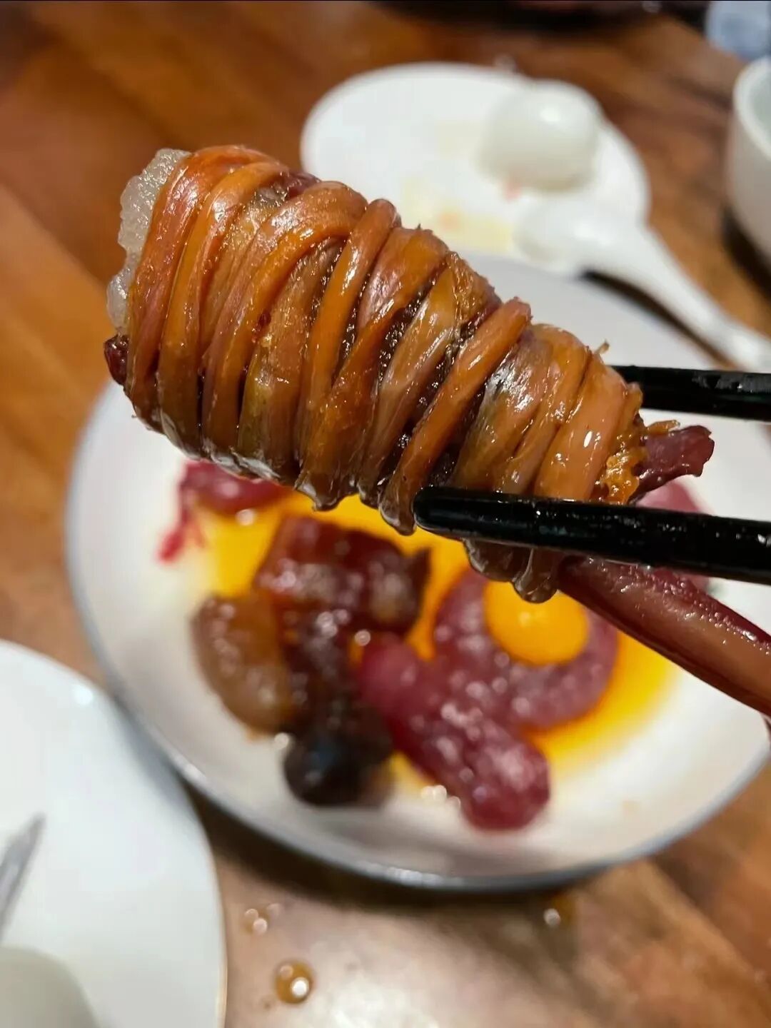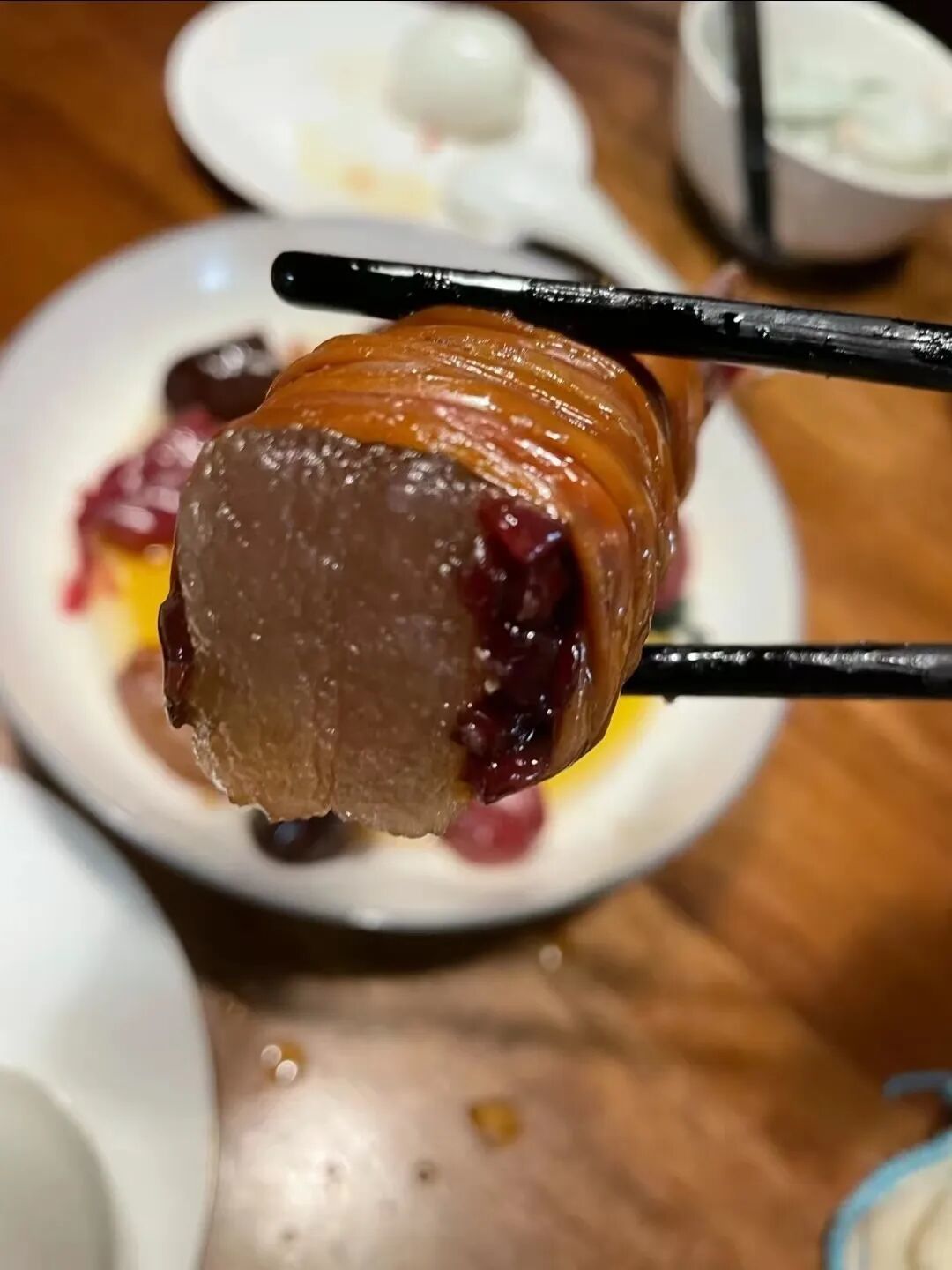 待蒸熟以后,鸭扎包显出一种诱人的琥珀色,中间那块肥猪肉则剔透莹润,一口下去,爽脆中带着丰腴,甜咸中带着酒香,肥而不腻,又带着几分软糯弹滑。