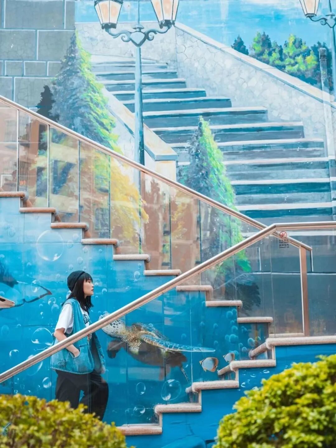 抽上半天时间,再去半山腰的桂山村转转,高低错落的石屋民居,清丽可爱的涂画阶梯,刹那闯入了不知名的艺术之地。