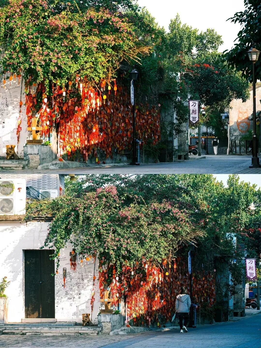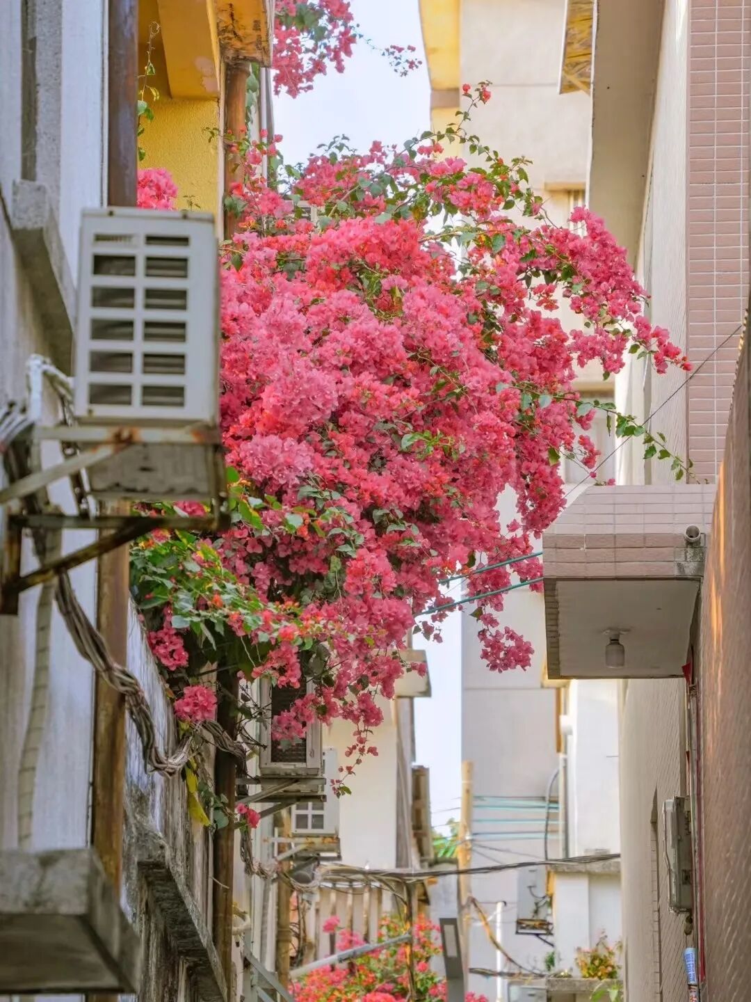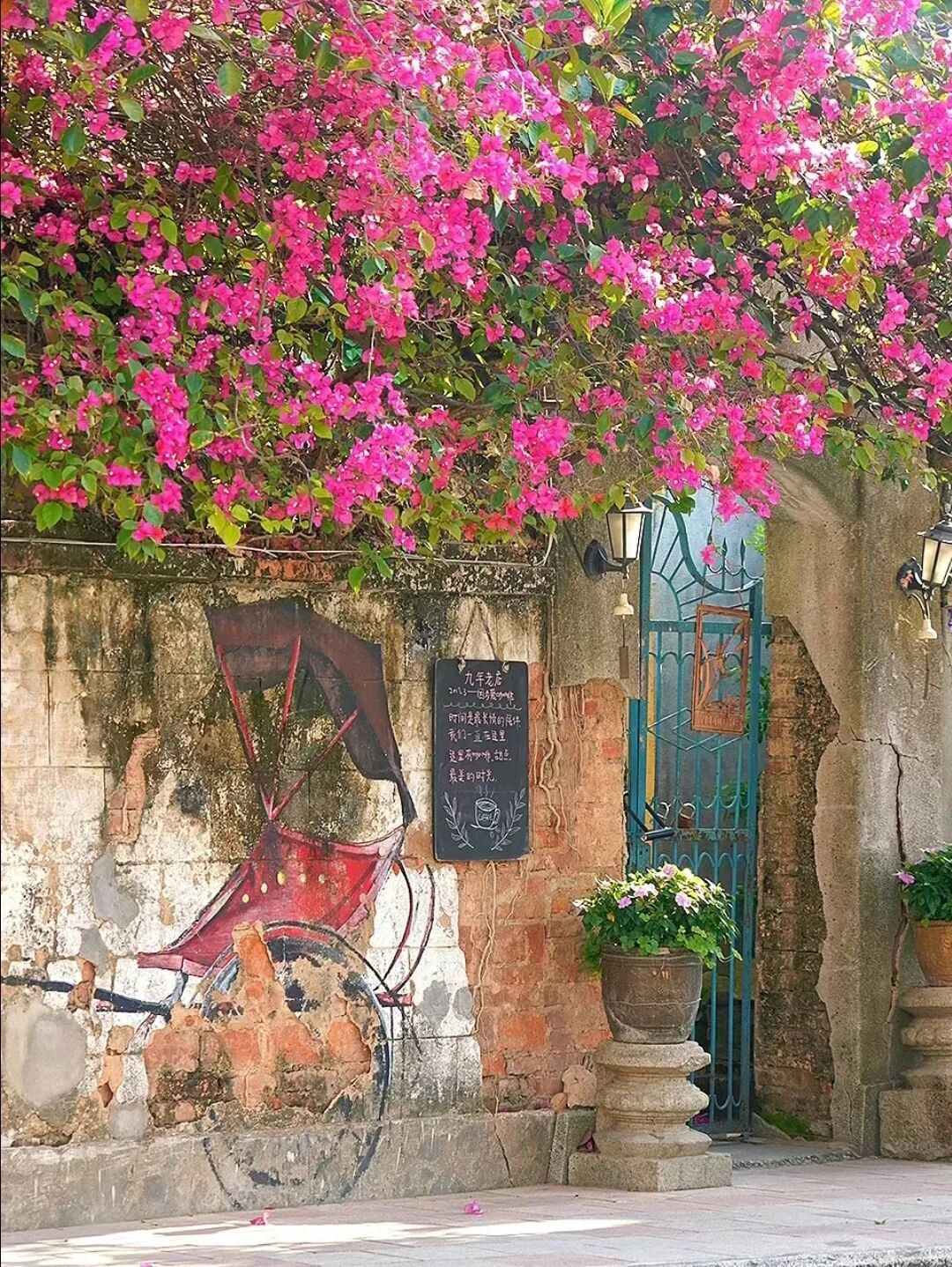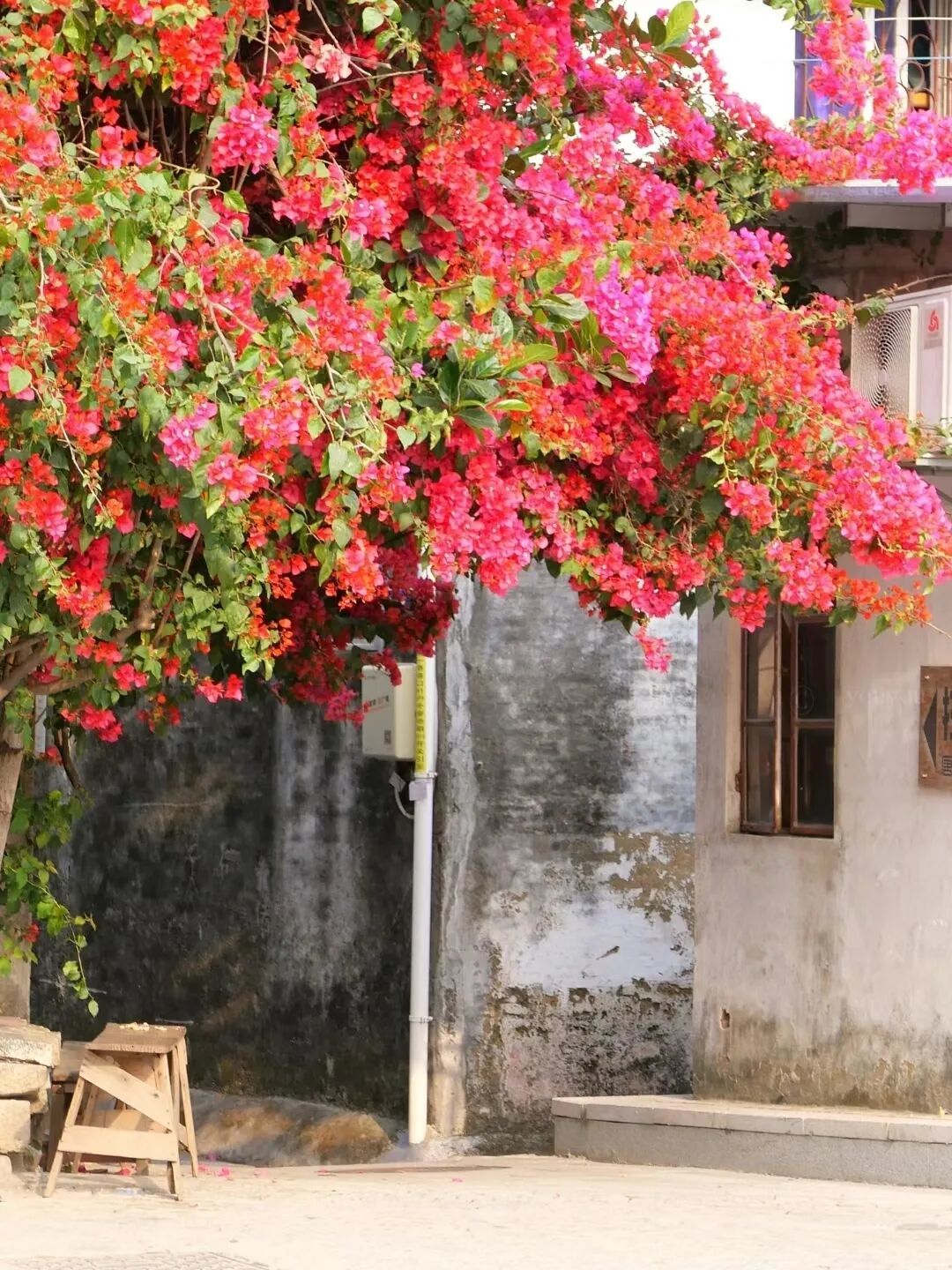 四月的古镇则格外浪漫,大片大片的三角梅开了,从老屋旧宅的墙头探了出来,宛如一丛丛花瀑,春日的气息就在每条街巷间流淌。