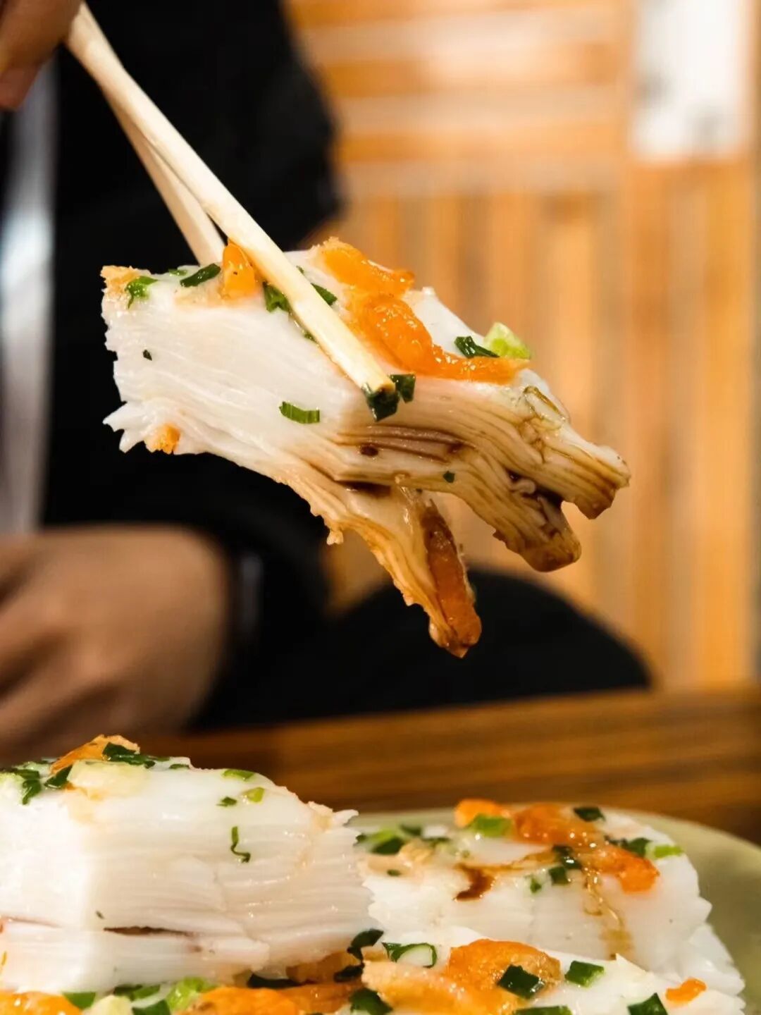 虾米糍也是珠海最有名气的小吃之一,是当地人常见的早点,它长得有些像是放了虾米的千层糕。